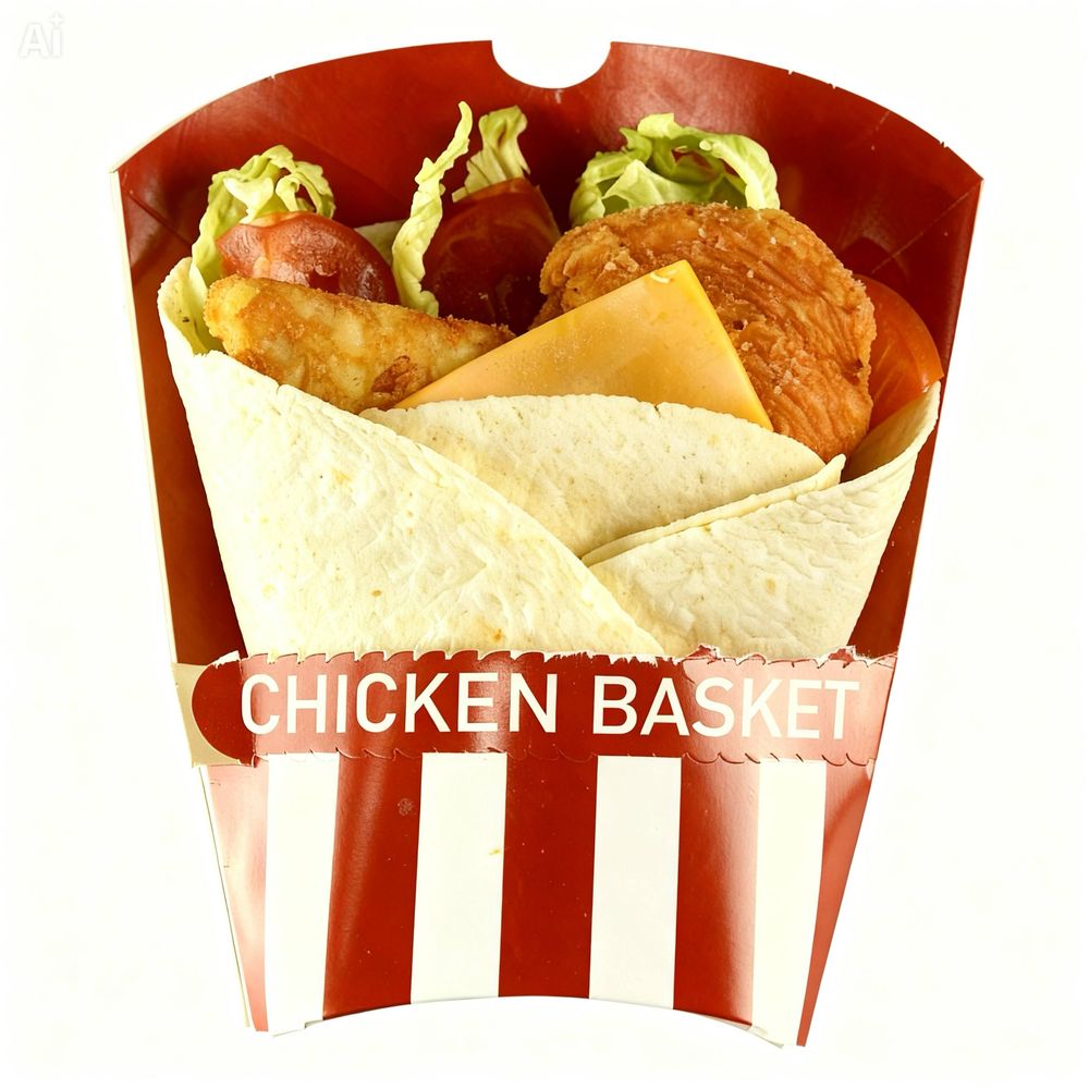 Тортилья, Стрипсы, Соус сырный, Соус чесночный, Сыр чеддер, Помидор, Айсберг, Хэшбраун.